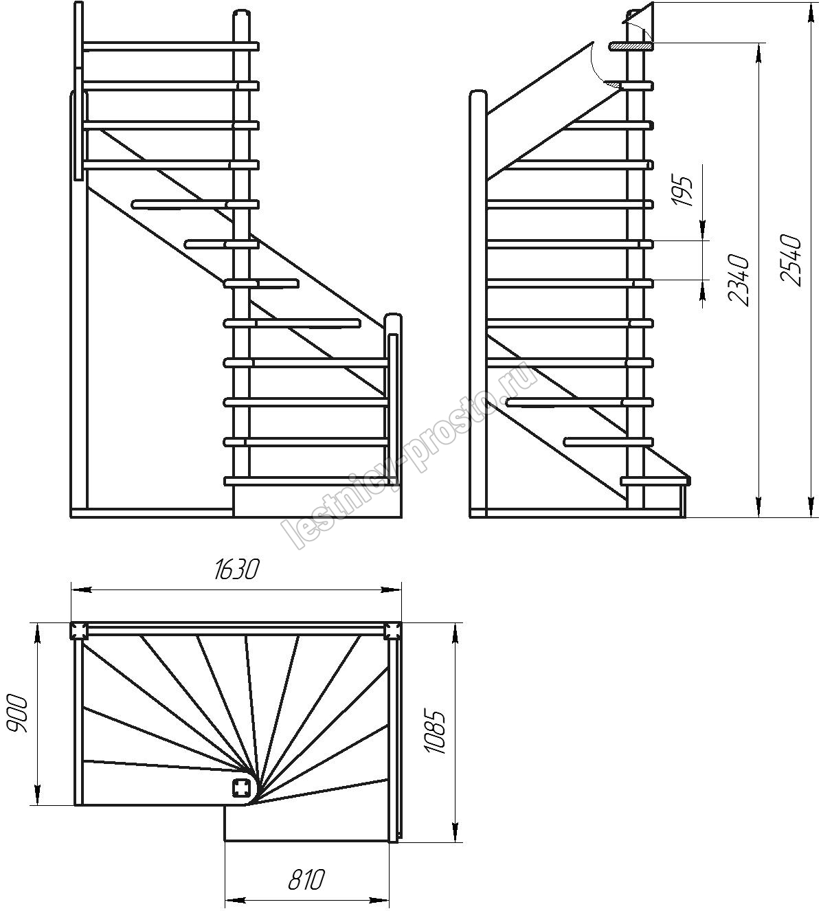 Деревянная межэтажная лестница ЛЕС-01 2340-2540 проем 1630-900, Лиственница