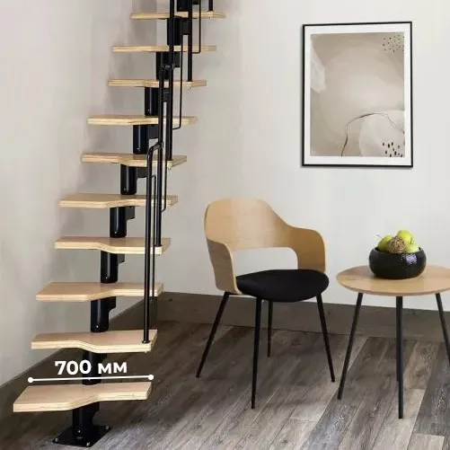 Удобная поворотная лестница на второй этаж. Дополнительные ограждения по первому маршу обеспечивают безопасность при подъеме и спуске, кроме того, небольшой угол подъема открывает всю площадь ступеней. Монтаж осуществляется силами двух человек на объекте по указаниям, приведенным в паспорте на лестницу.