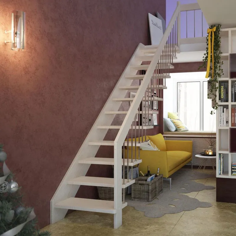 Небольшая аккуратная лестница, хорошо подойдет для помещения с небольшим проемом, поможет сэкономить пространство и организовать комфортный подъем на  уровень выше. Возможны варианты лестницы из сосны под покраску, сосны, дуба, бука или ясеня. Для увеличения срока эксплуатации мы рекомендуем покрыть элементы лестницы защитным средством. Вы можете сделать это самостоятельно или заказать предварительное покрытие необходимым средством (или тонирование) в нашем цеху.