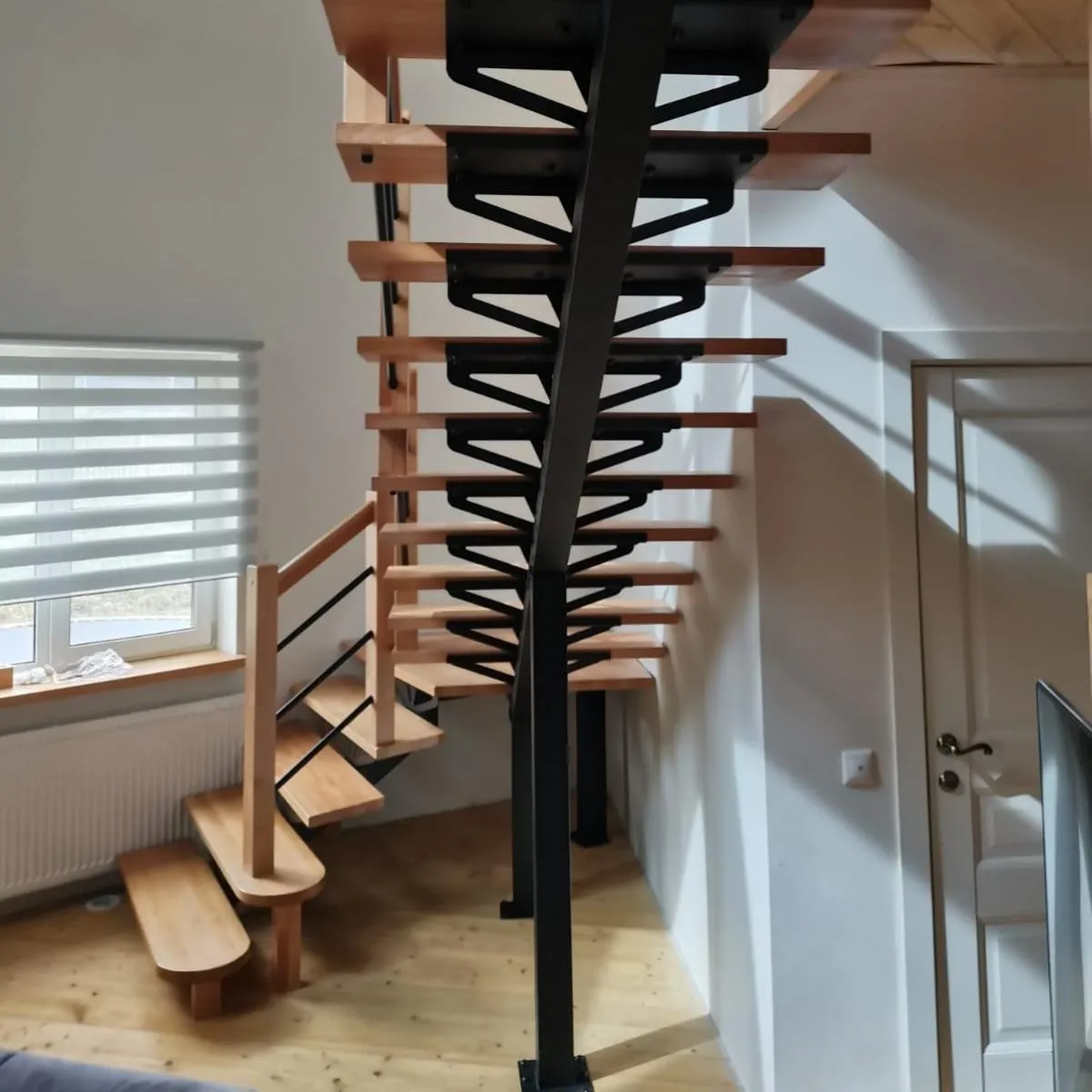 Ступени и поручень лестницы изготовлены из дуба, остальные элементы из сосны.