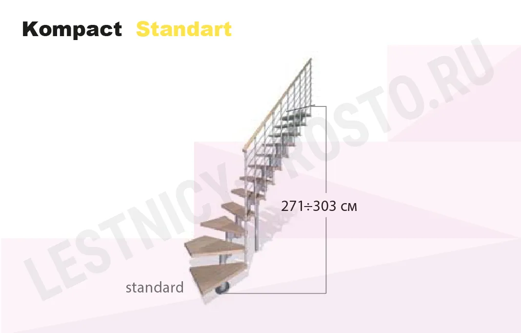 При монтаже этой лестницы, возможно регулировать высоту и глубину шага, таким образом можно получить лестницу под высоты этажа в диапазоне 2250 - 3030 мм, кроме того, установив дополнительный комплект увеличения высоты, можно поднять высоту лестницы до 3730 мм. Ширина проступи регулируется при монтаже в пределах 180 - 220 мм. Каркас и стойки ограждения выполнены из пластифицированного металла. Уникальный модульный каркас позволяет собрать лестницу необходимой формы.