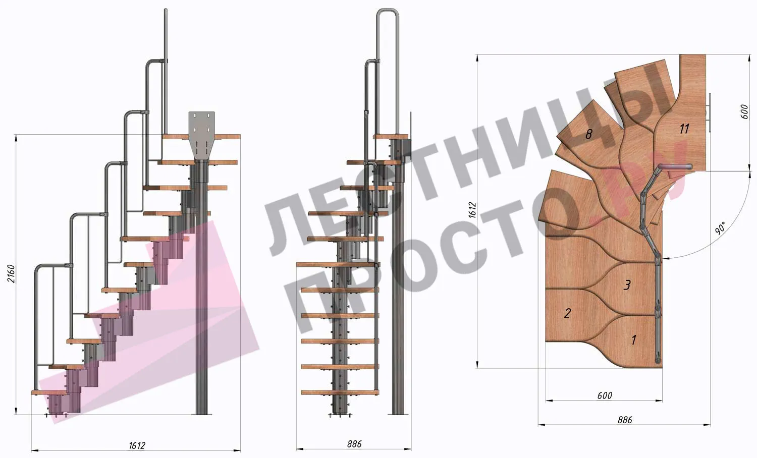 Лестница Prosto Urban Grey г-образная гусиный шаг 600 мм/ Ступени из берёзы мультиплекс