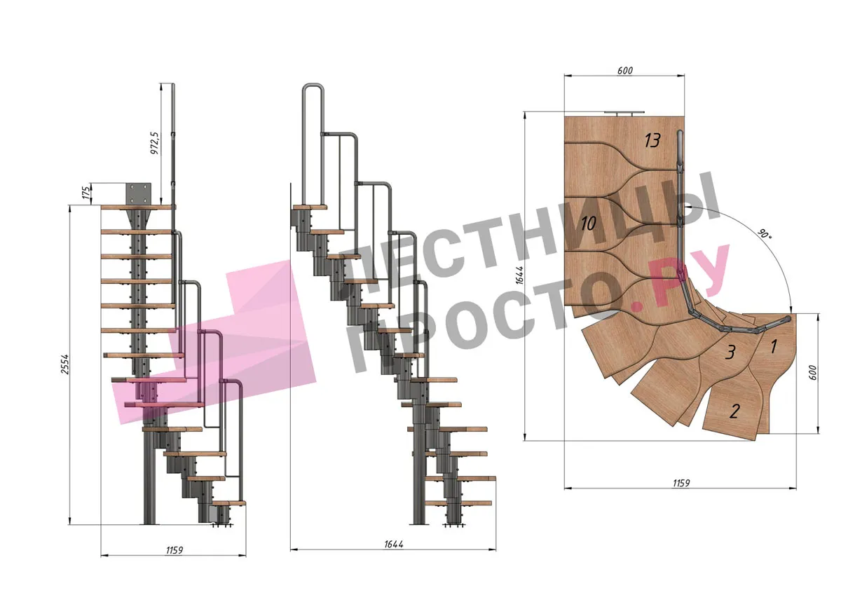 | Лестница Prosto Urban White гусиный шаг 600 мм, h216-312 см (12 ступеней), бук |