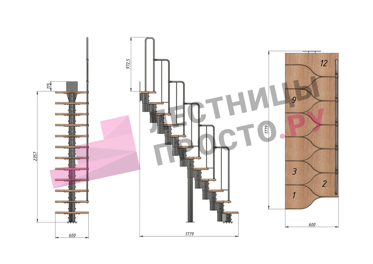 | Лестница Prosto Urban White гусиный шаг 600 мм, h216-312 см (12 ступеней), дуб |
