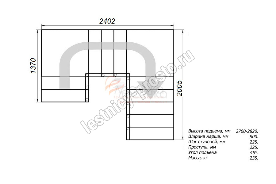 Модульная лестница Комфорт 225 2700-2820, Серый, Лиственница, Нержавеющая сталь