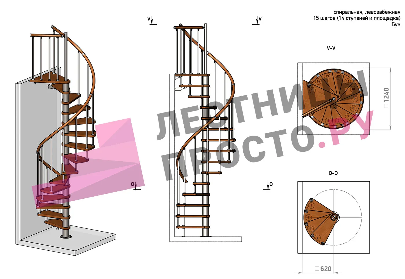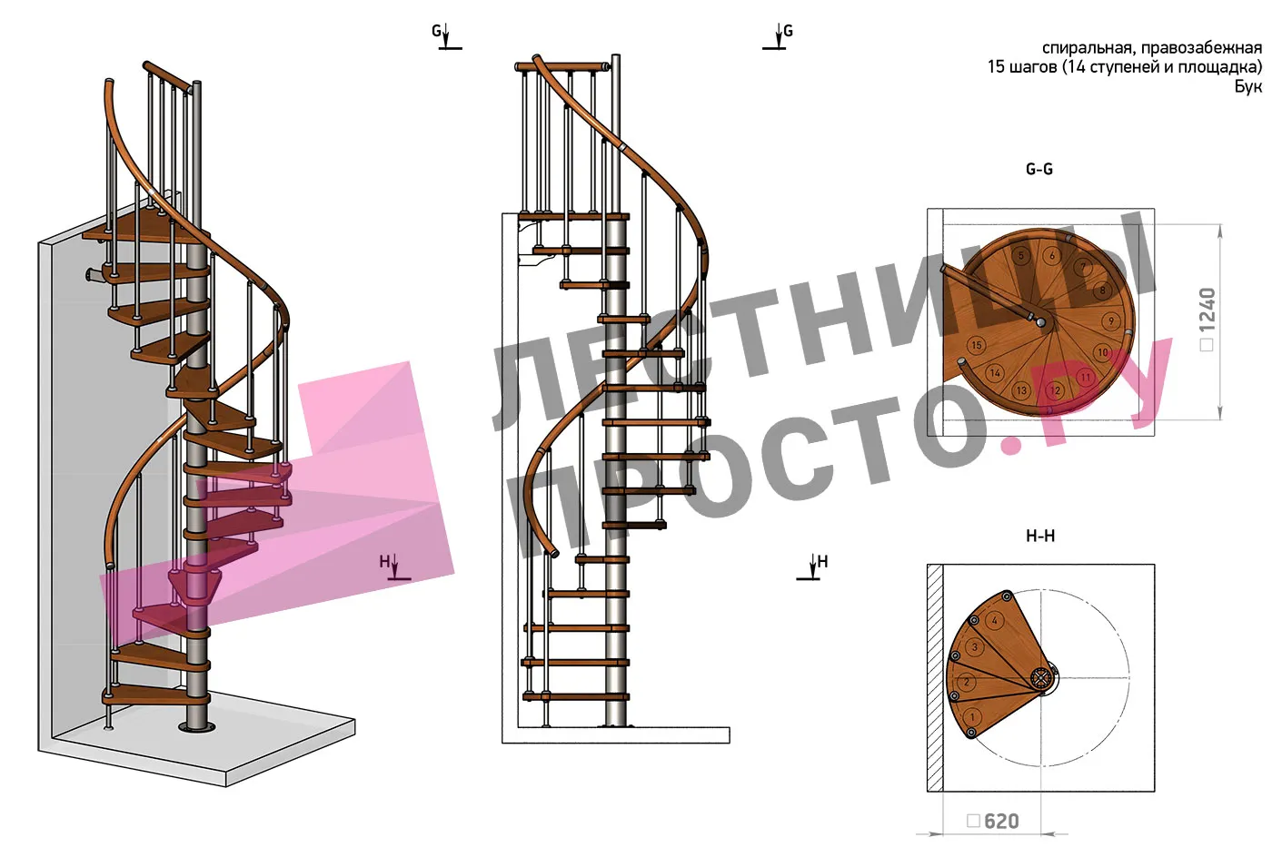 Решение о направлении поворота принимается при сборке лестницы - универсальная конструкция позволяет собрать правозабежную и левозабежную лестницы. Высота ступеней регулируется с шагом 3 мм. в пределах 217-247 мм., благодаря чему, лестница прекрасно подгоняется под необходимую высоту.